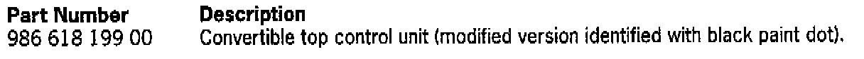 As of December 23, 1999, a modified convertible top control unit is being installed in production. The modified top control unit can be identified by a black paint dot located on the blue base plate. In cases of complaints, first check the relay to see if it has the paint dot on the base plate, then proceed with the diagnostic checks.