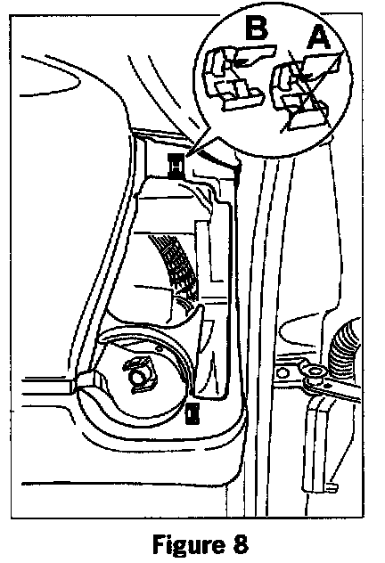 Stick felt/sponge rubber strips on the contact points between the air duct and the heater blower or other components (See arrow on figure 3). Stick felt or sponge rubber strips (approx. 35x25 mm) over all the rivets of the knee protection reinforcement bar (See figure 4. A - rivet covered, B - rivet not covered).