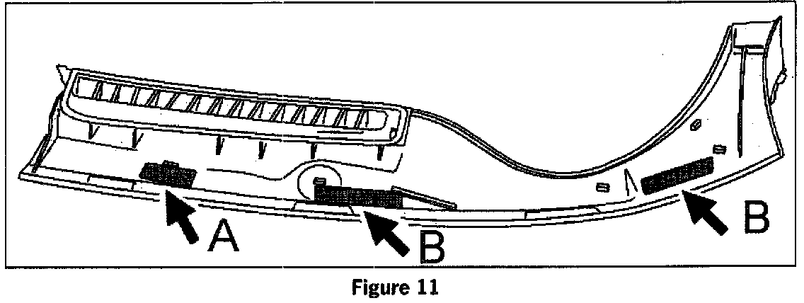 Apply felt strips to the contact surface of the defroster cover touching the A-pillar trim. If the felt strips are already present, check them for correct positioning (see arrows in figure 10) and correct if necessary. Check contact points on the underside of the defroster covers. If necessary apply new felt strips. See figure 11.