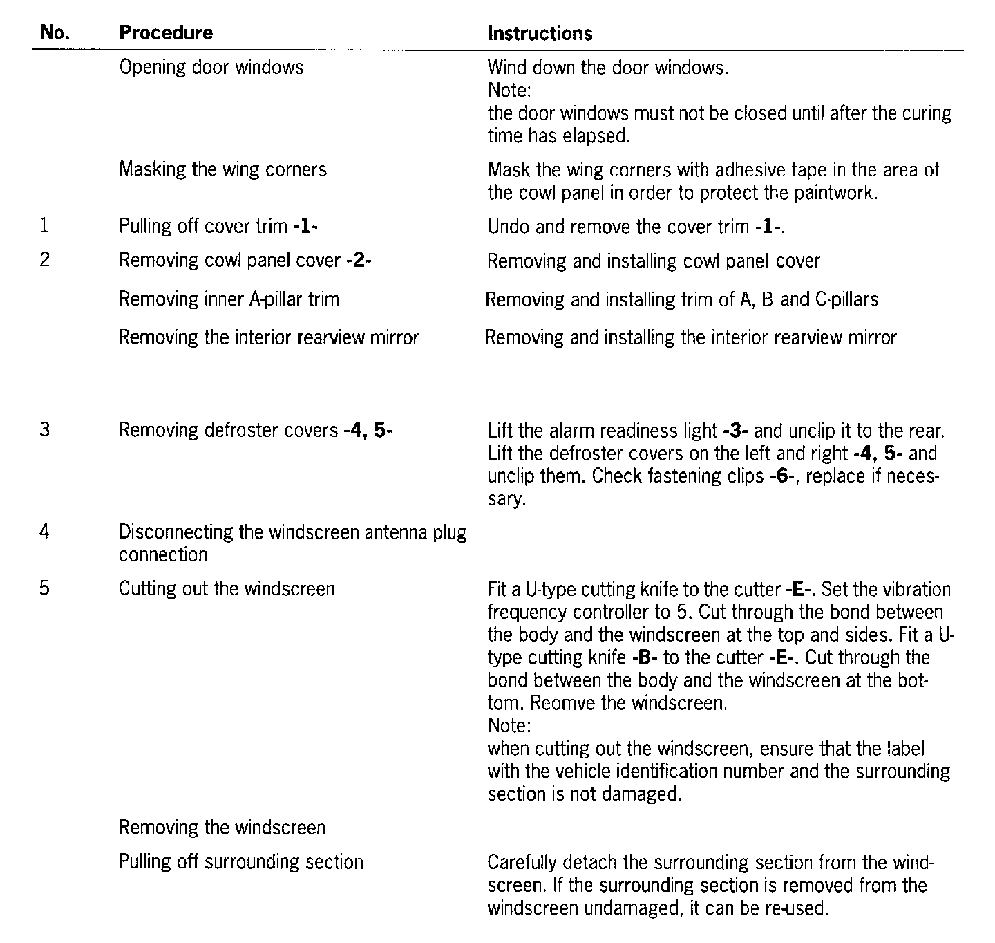 NOTE: The removed windscreen can be reinstalled if there is no prior damage to the windscreen and the windscreen was removed without damage.