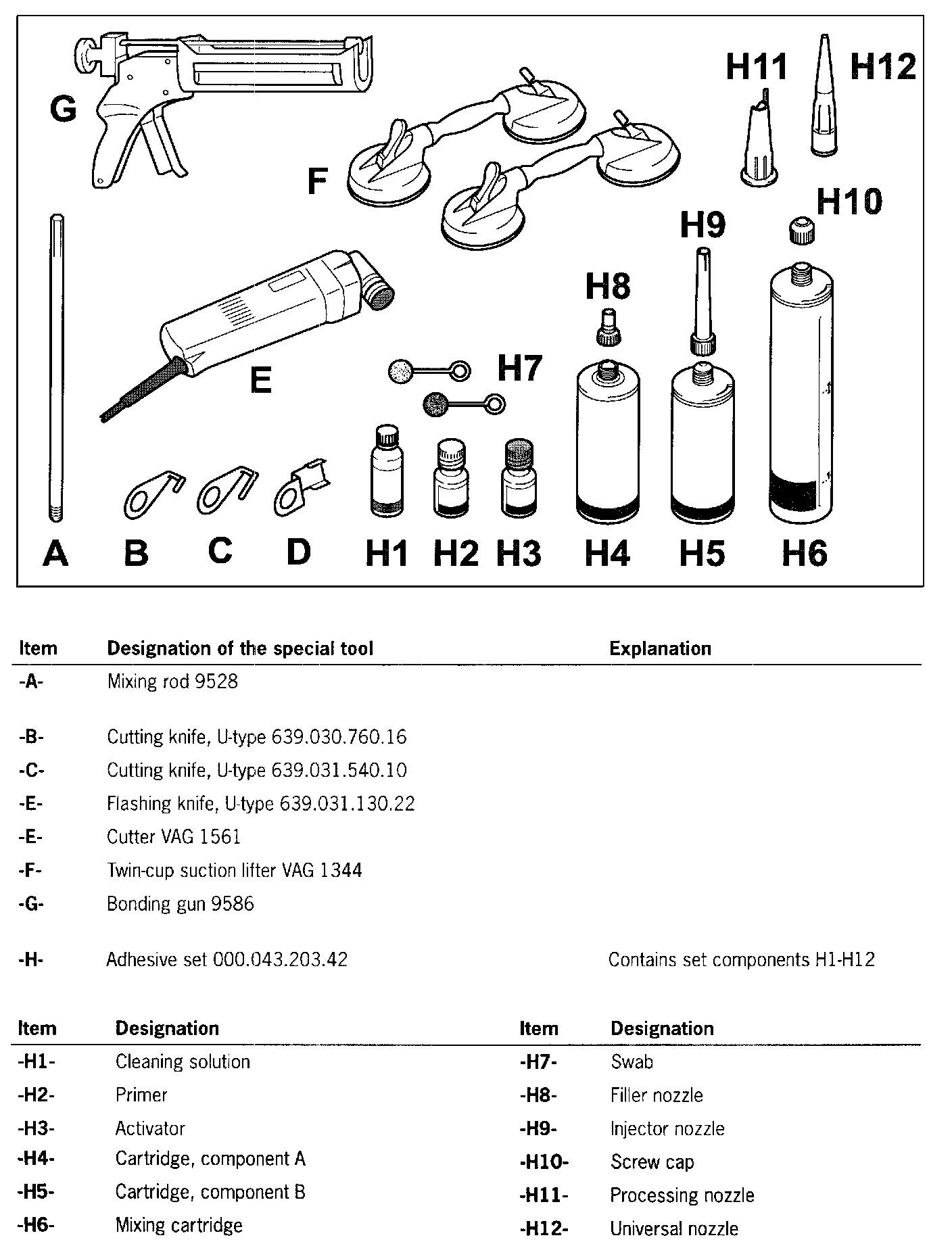 The tools and materials shown are required for removing and installing the windscreen with 2-component adhesive.