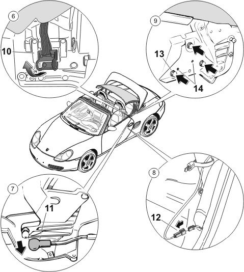 INFORMATION: After replacing the convertible-top or detaching the push bars and operating the convertible top, it is essential to carry out basic adjustment of the convertible-top gears to ensure it closes correctly. Refer to Adjusting convertible top gear