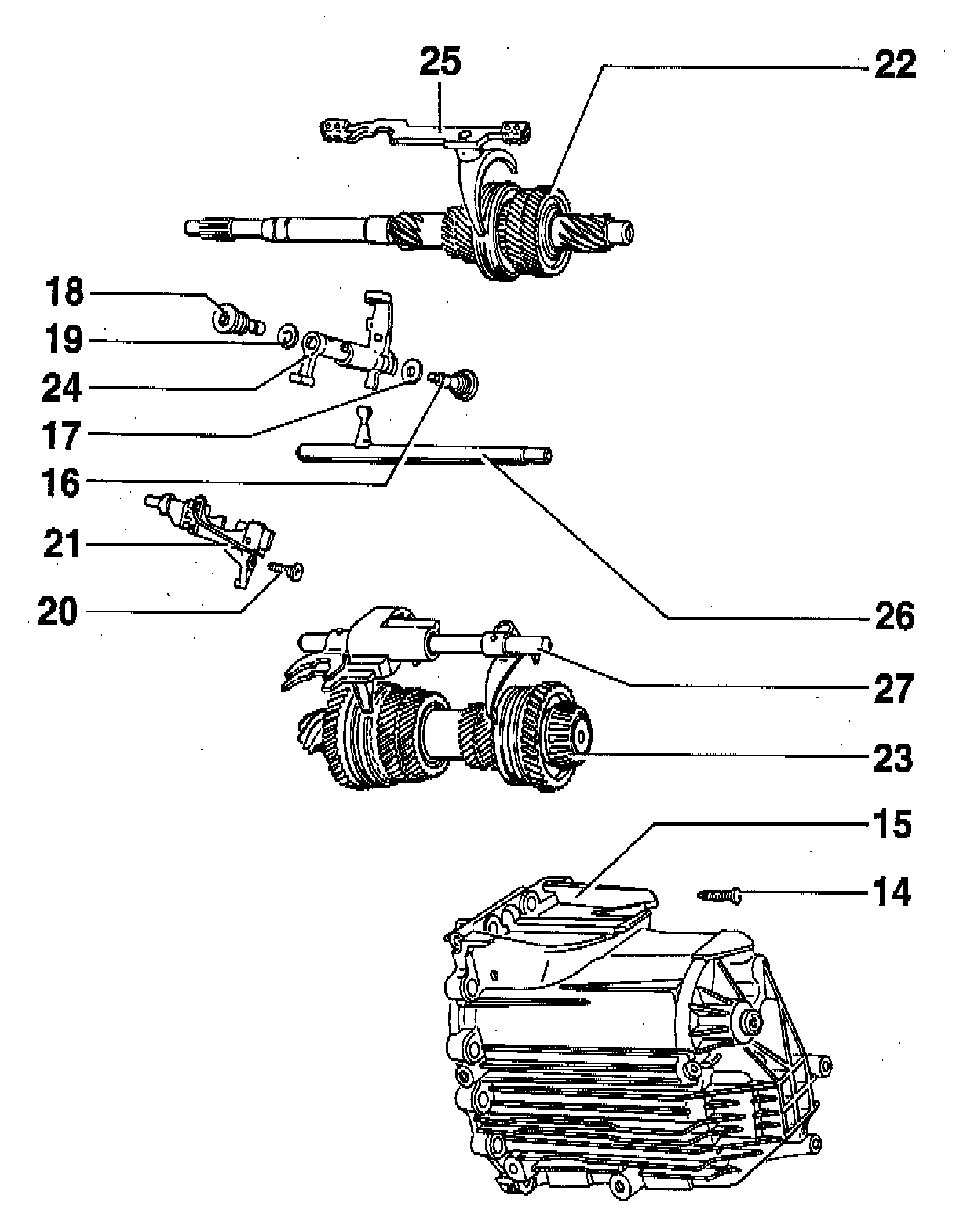 27. Shift rod with shift fork for 1st/2nd/5th and reverse gears
