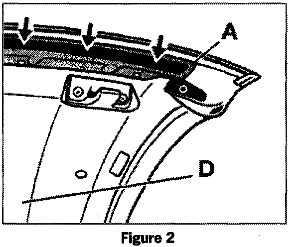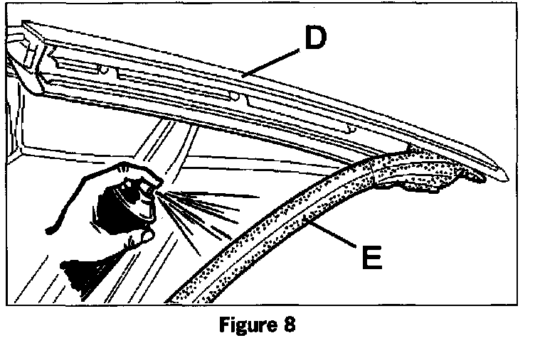 Open the top half way. On vehicles (without a flocked retaining strip, cover the area that contacts the windshield frame seal with a piece of Teflon tape. Cut a strip of tape 20 x 1190 mm and place as shown in figure 2 arrows.