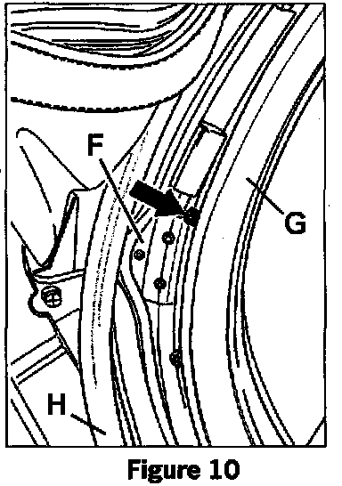 The main control arm (also called the push bar of the roof frame - figure 10, item H) touches the screw of the clamp (figure 10, item F) when the top is closed. Rubbing marks on the main control arm or impressions on the Teflon tape that is wrapped in this area indicates this condition.
