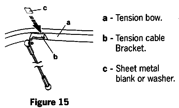 The brackets (Item b, figure 15) that are riveted to the underside of the tension bow (item a, figure 15), which the tensioning cables attach to, are loose. The rivets, which secure the brackets, become loose due to the force exerted by the tensioning cables.