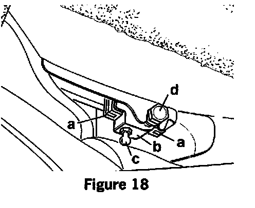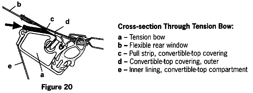Move the convertible top to the service position. Drive a 10 mm washer or a sheet metal blank (approx. 10 x 10 mm) between the bracket and the bow (item c, figure 15). A washer with a necessary thickness must be selected so that when it is installed, there is no longer any movement of the bracket.