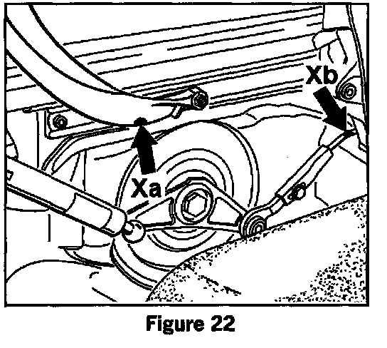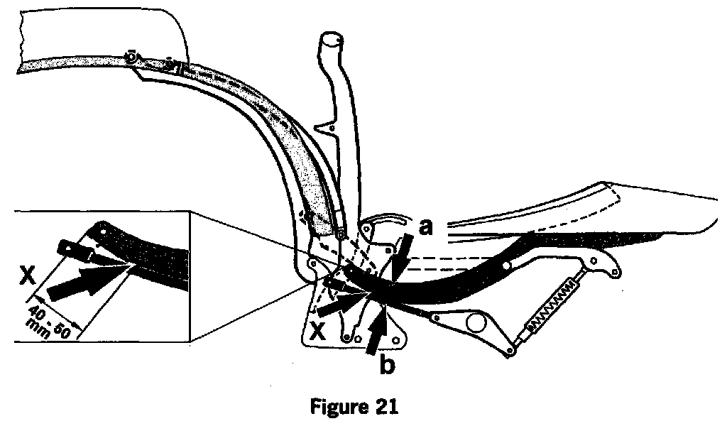 4. The location or contact point (arrow X, figure 21) of the guide arm and push bar is visible on this position. If the guide arm is touching the push bar, mark the contact point on the guide arm (arrow X, figure 21).