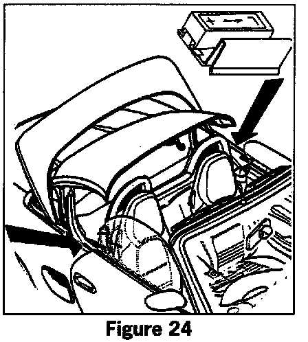 1. With the convertible-top compartment lid open, move top part of the stops in the water channel (arrow, figure 25) rearward to the "low position on the left right hand sides. Unclip cover trim from the guide arms of the convertible-top compartment lid.