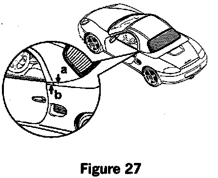 9. When the convertible-top compartment lid is closed, its front tips (arrow a, figure 27) must be at the same level as the cover on the mount for the Roof Transport System (arrow b, figure 27).