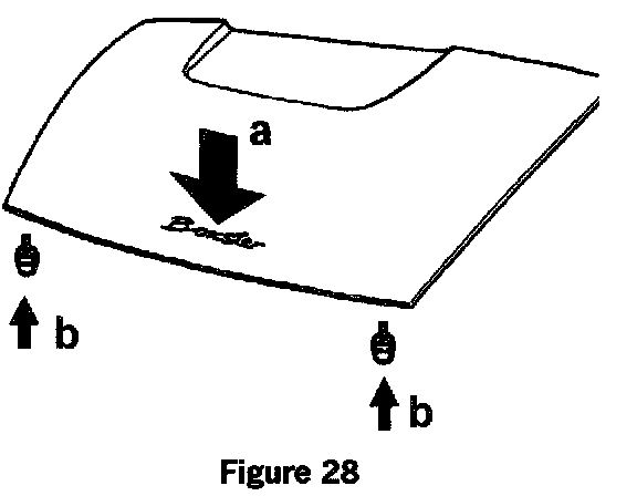 Check adjustment of the stops in the lid. The rattling noise can also be produced with the vehicle stationary by briefly pressing on the rear edge of the lid (arrow a, figure 28) several times.