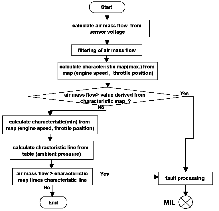 The output voltage of the air mass meter is a measure of air mass flow. The diagnostic routine compares the mass flow measured by the air mass meter with a calculated mass flow, derived from engine speed and throttle valve position.