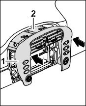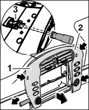 3.1. Push the cover -1- with the center nozzle -2- into the instrument panel, ensuring that the clips are engaged at the top and the locking tabs at the side.