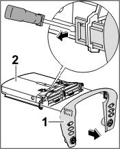 3.1. Push in locking tab on the cover -1- using a screwdriver. Pull out center nozzle -2-.