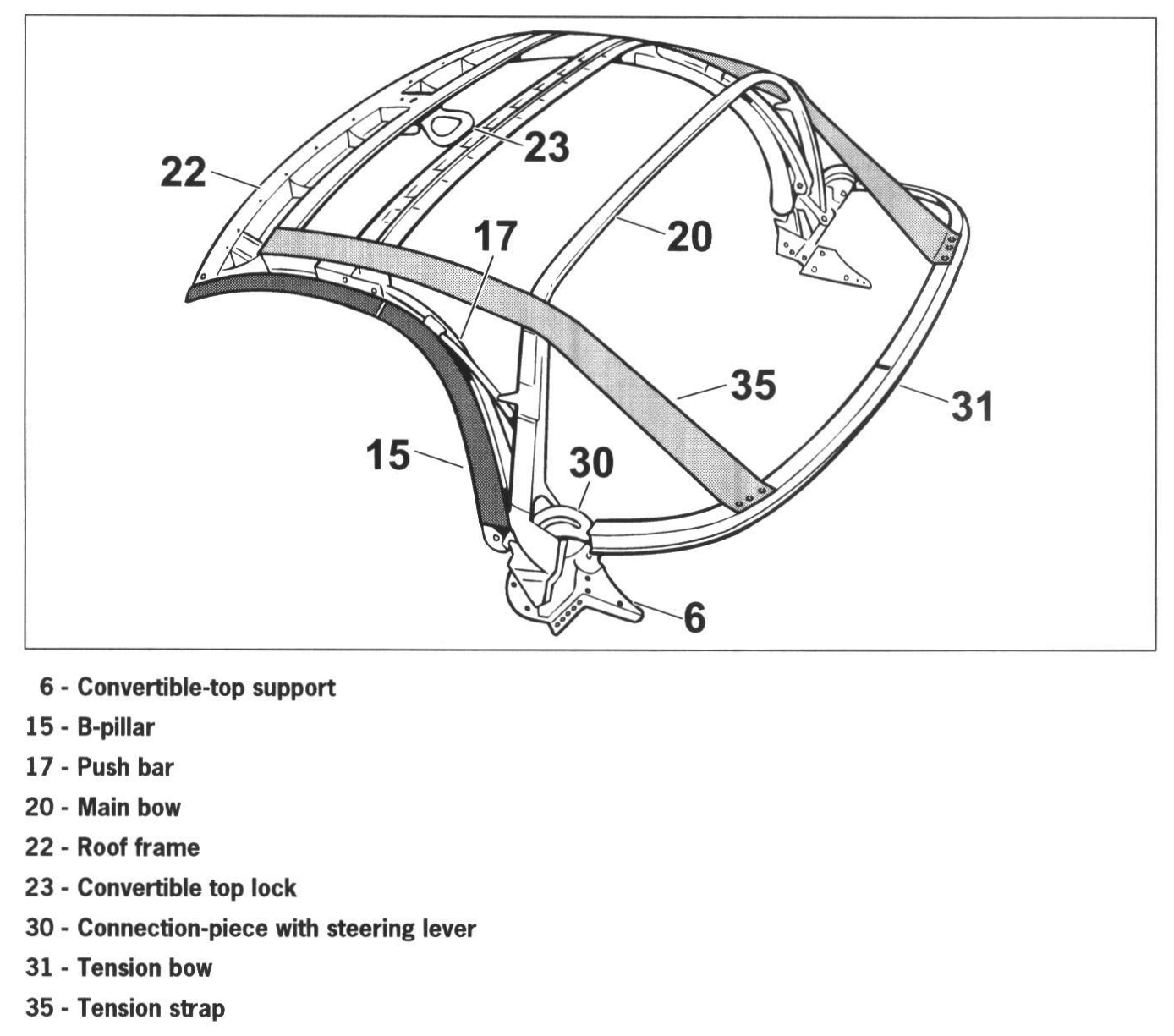 1. Position the main bow -20- on the convertible-top support -5- and drive lever -16-. Then join with the pins, dia. 8 x 70 -21- and dia. 8 x 45 -18-,
