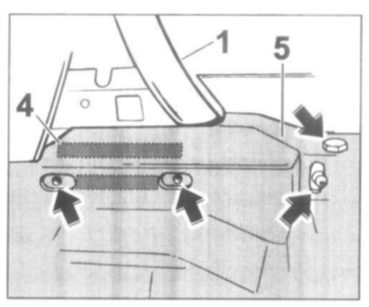 2. Affix two strips of double-sided adhesive tape -4- in the area of the convertible-top support fastening point.