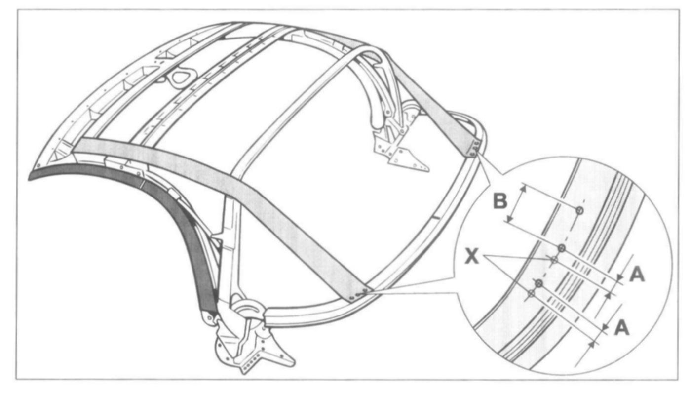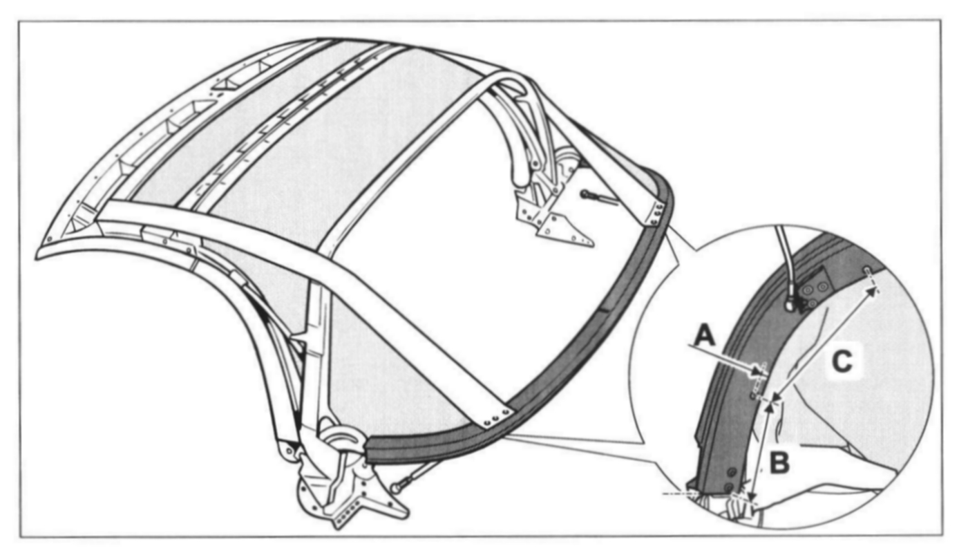 - Position tension strap -35- on tension bow -31- on the holes provided, rivet on the tension strap with the pop rivets -36- (parts scope component of convertible-top covering)