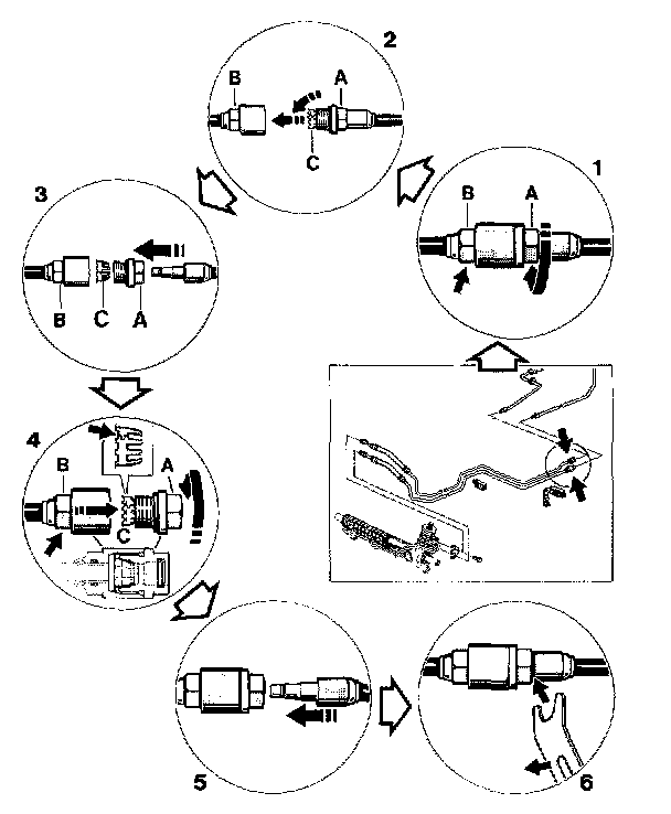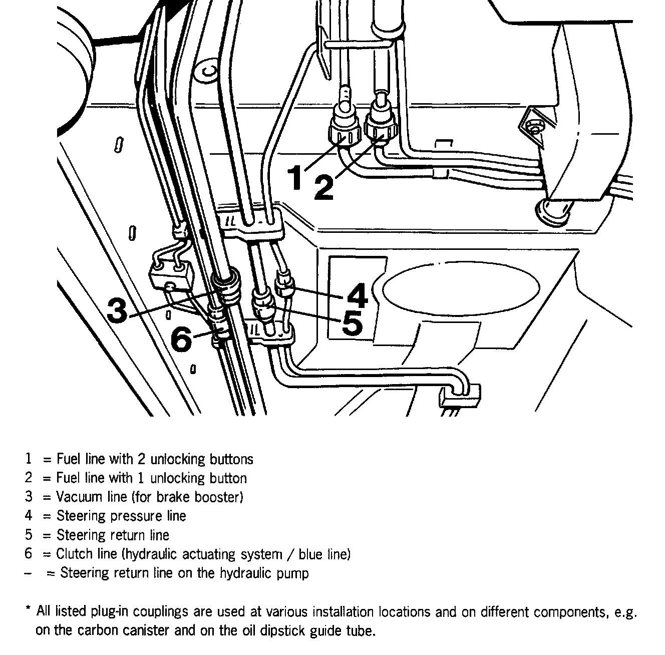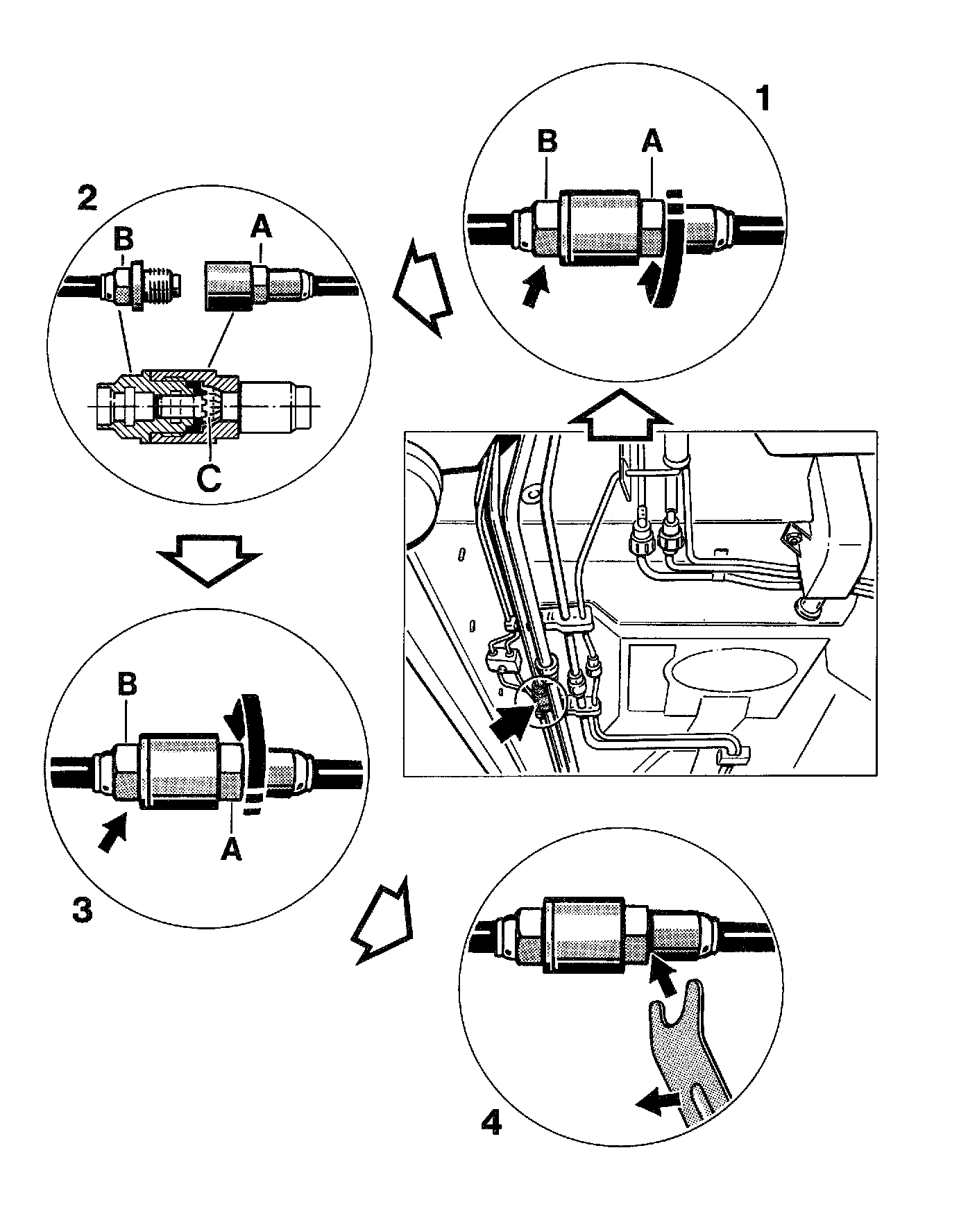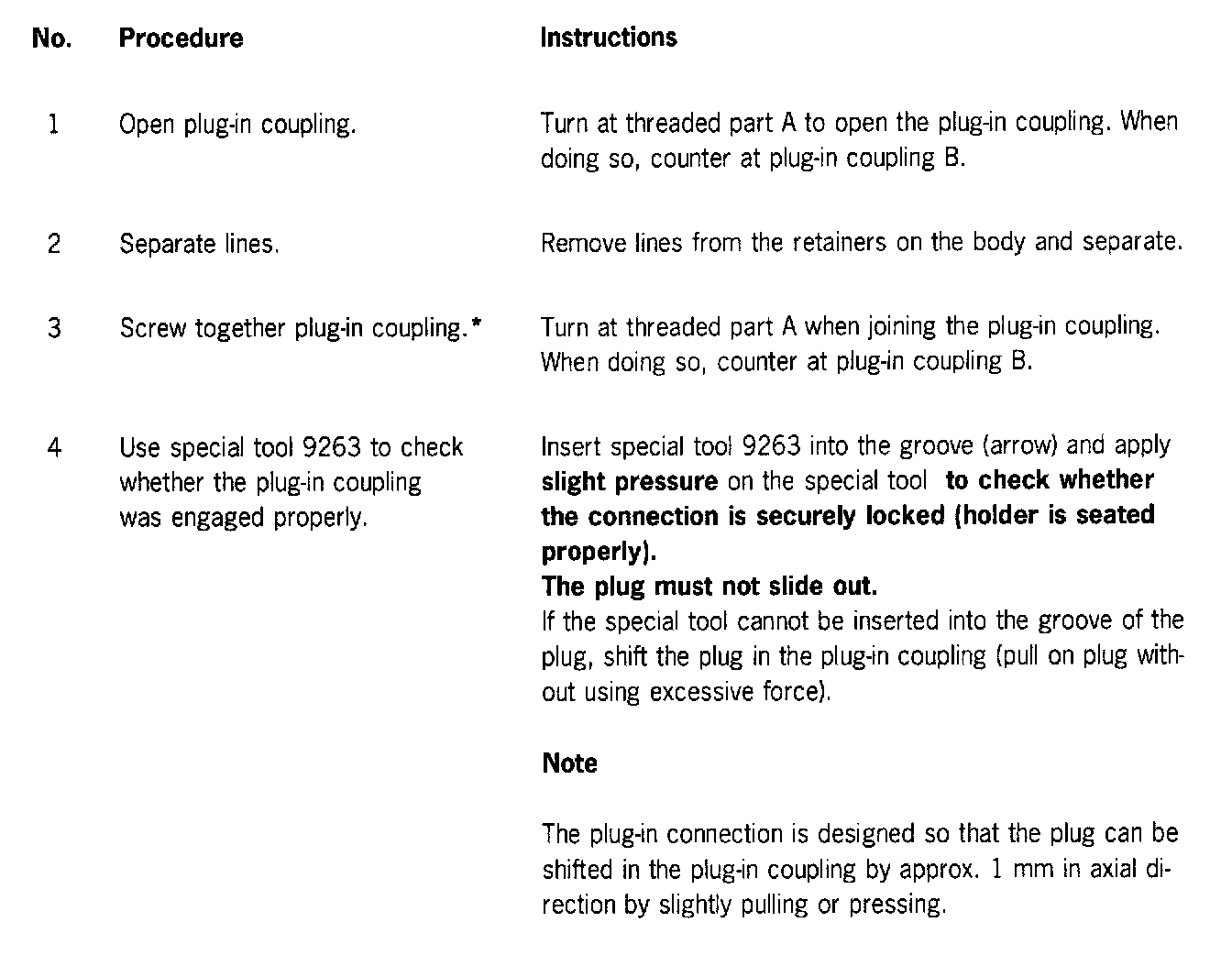 Pipelines the were fitted once before are joined by screwing together (as opposed to new lines and steering lines, which are plugged together). This is necessary because holder C is located very deep in the threaded part of the plug-in coupling and cannot be removed with conventional workshop equipment.