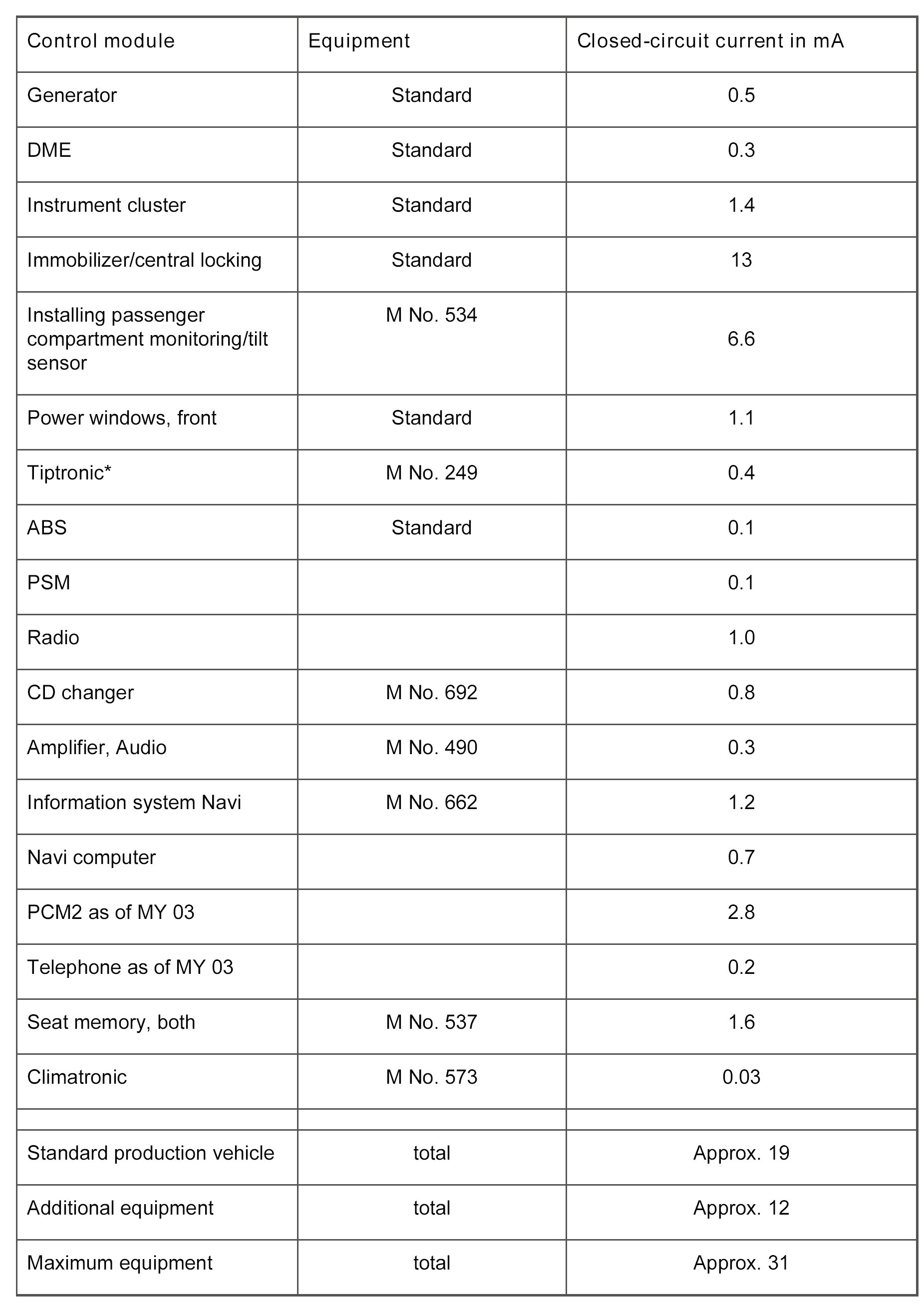 NOTE: Before measuring the closed-circuit current, determine the vehicle equipment (M-numbers) and establish the expected closed-circuit current with the aid of the attached table.