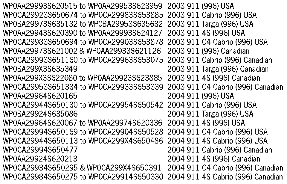 Use the VIN range below as a general guideline. The VIN can be checked in the Porsche e-DCS/WWS for confirmation of an open recall campaign. Refer to Attachment "A" to determine if a particular vehicle is eligible for this recall campaign (or service action). Attachment "A" for W522 VINs is an electronic attachment only, and will be accessible via e-DCS Document repository.