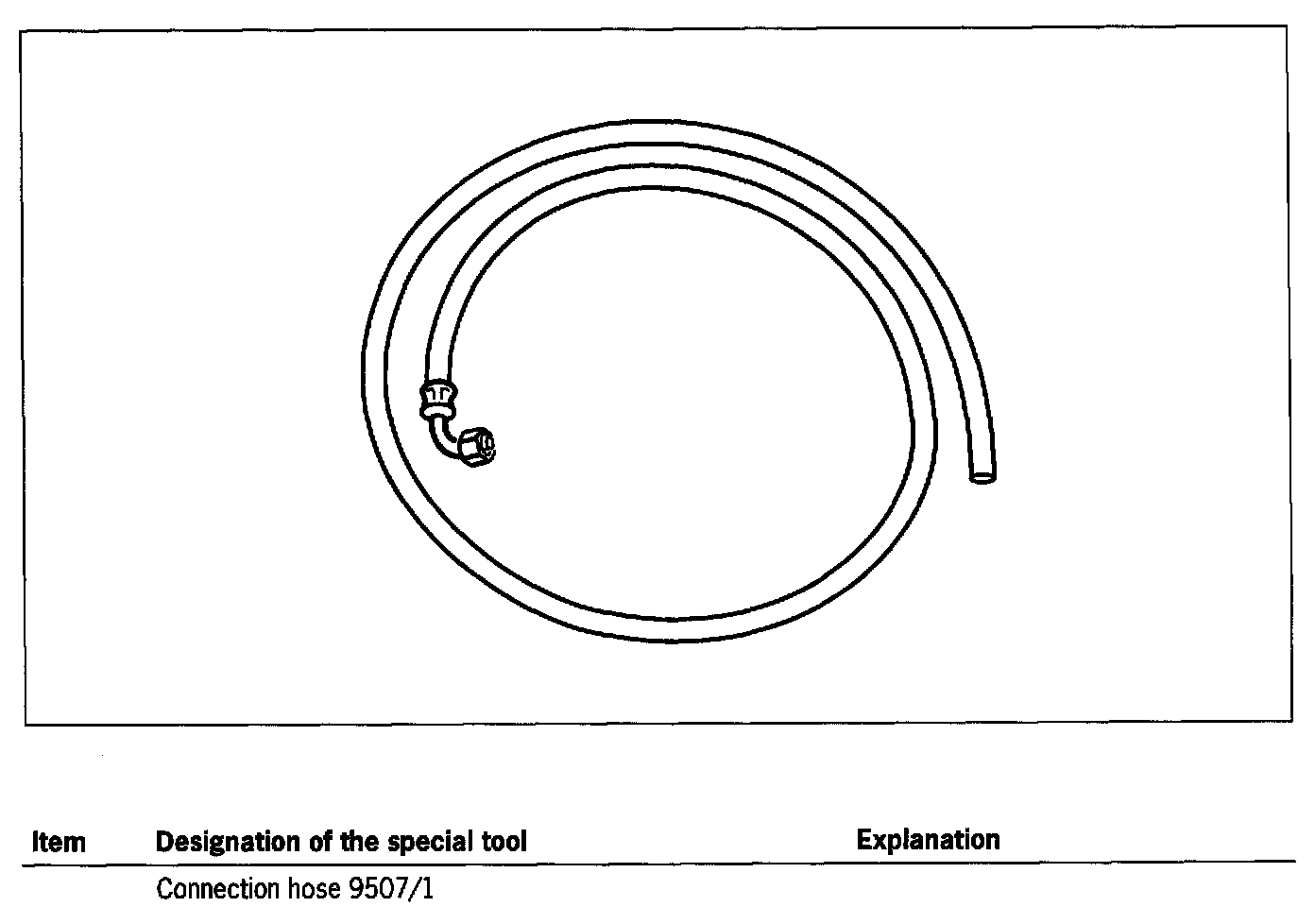 6. Screw connection hose 9507/1 -A- onto charging valve. Top up with ATF via the charging valve until surplus ATF runs out at the control screw bore.