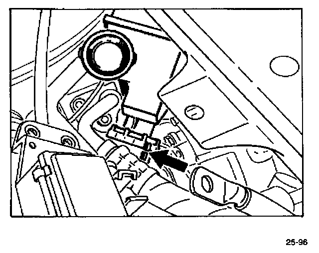 6. Remove the fluid of the power steering in the supply tank until below the connection. Remove the servo-tank (bayonet lock). Observe the marking (arrow) during installation. Seal off the connection against dirt