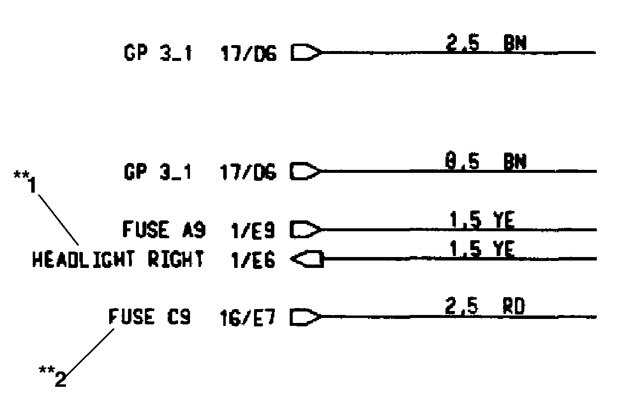 In the case of wires that branch off onto another sheet, the coordinates and, in some cases, the terminal designations are specified.