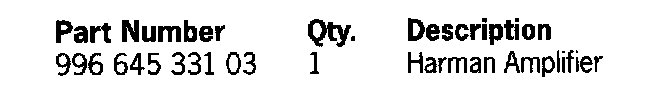 Remove amplifier (Harman), Part No. 996 645 331 02, according to Boxster Technical Manual, Group 9, Chapter 99 44 19 and replace with new amplifier (Harman), Part No. 996 645 331 03