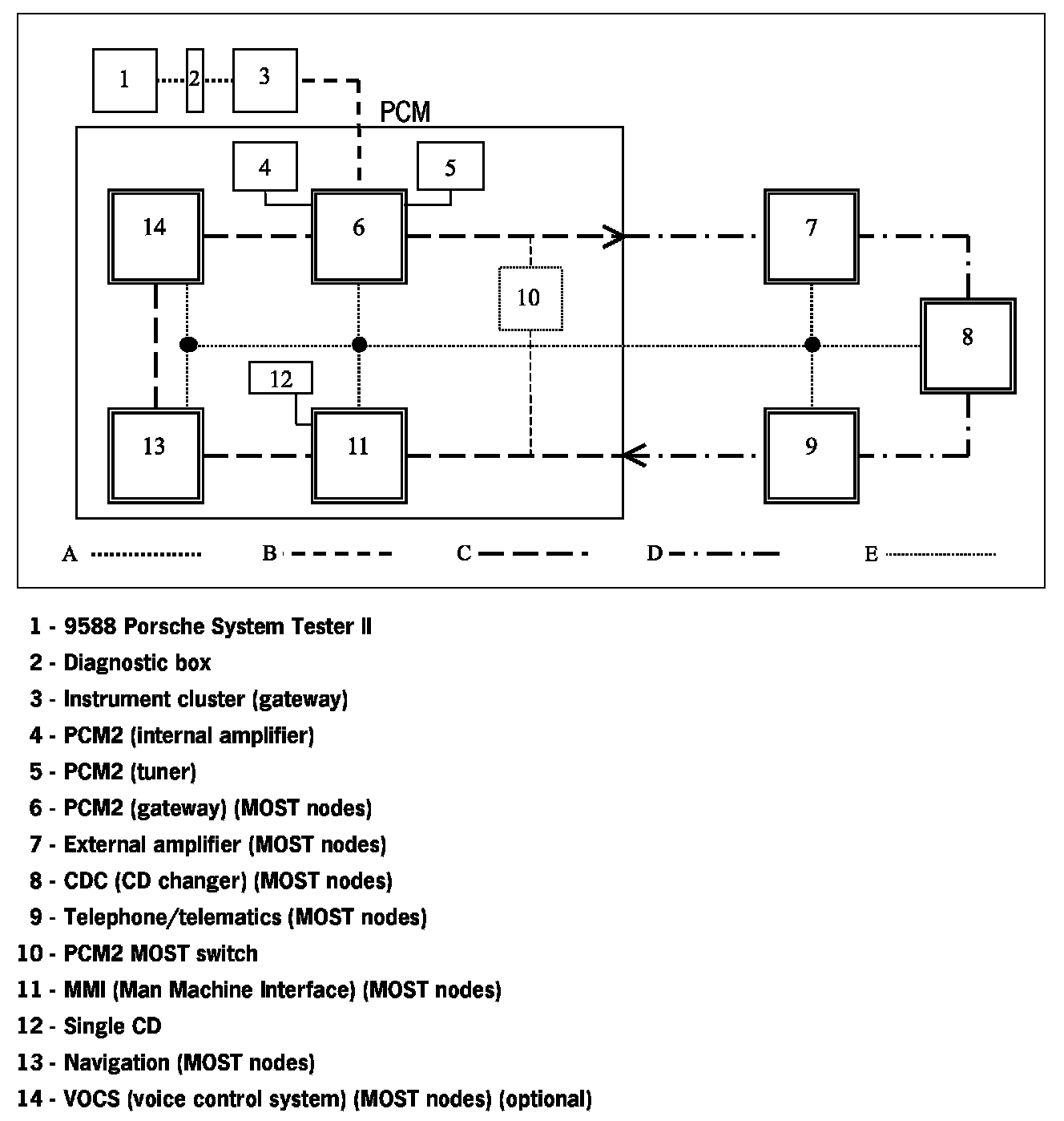 The PCM2 consists of at least two but a maximum of four MOST nodes, (Gateway, MMI and Navigation and VOCS (optional)), which communicate with each other via the electronic MOST. Data is transferred outside of the PCM2 via the optical MOST.