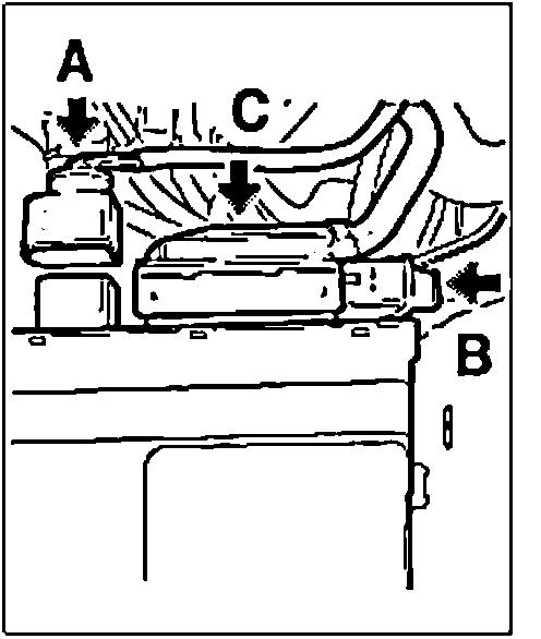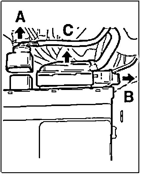 2. Press connector "A" and pull out. Open lock "B" on plug "C" and remove plug.