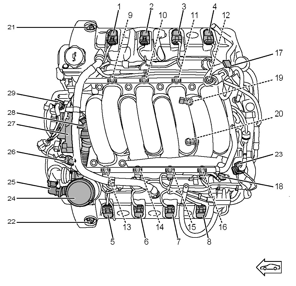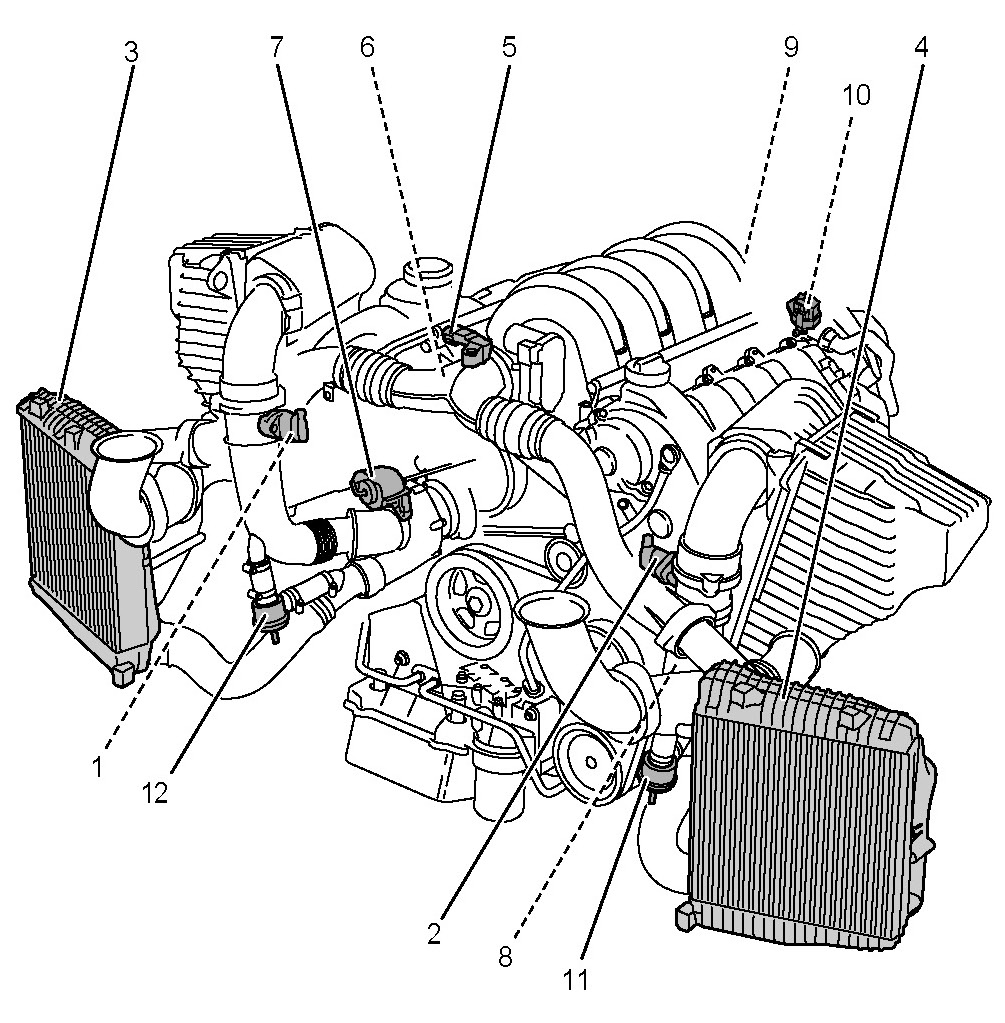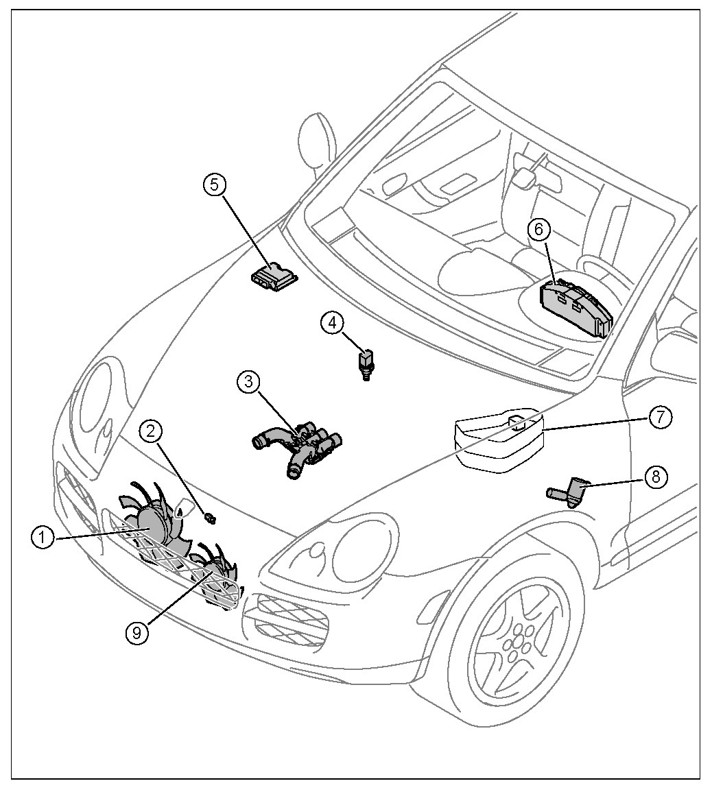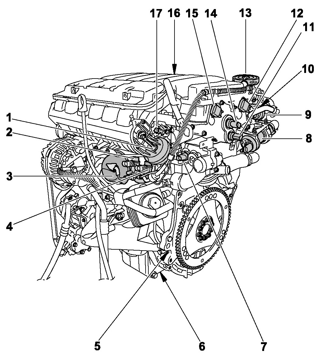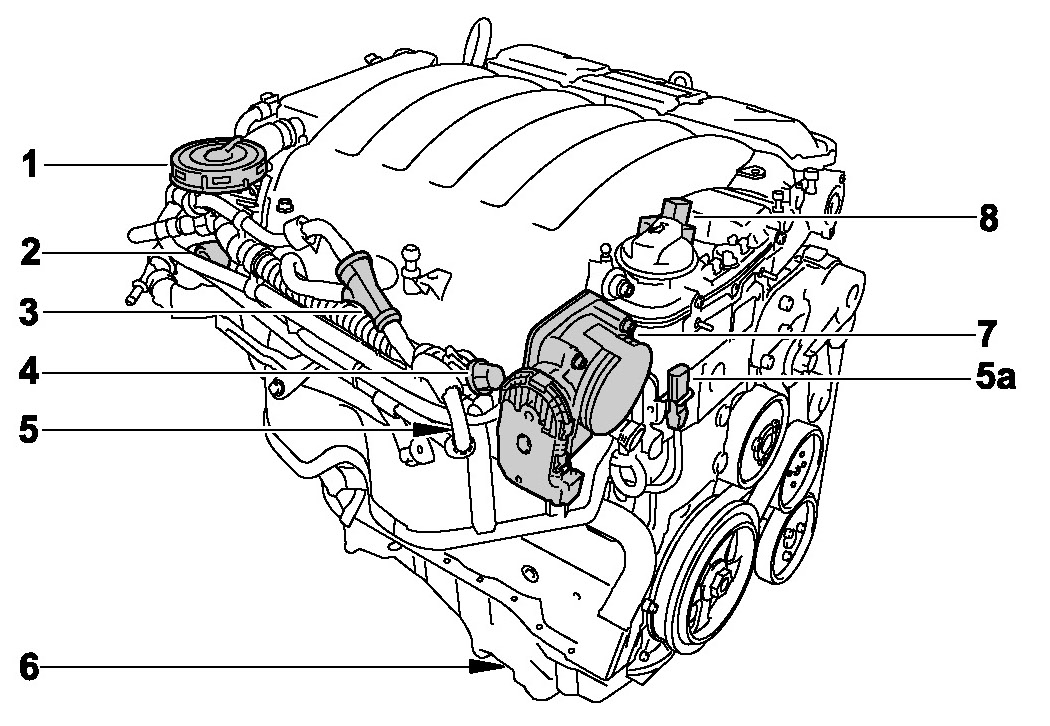 - Components close to the engine: the position of the components is shown from various views of the engine, making it easier to find your way around the engine compartment. Components that are actually hidden in the view are indicated or traced; hidden components can be recognised by the broken line between the item number and the component itself.