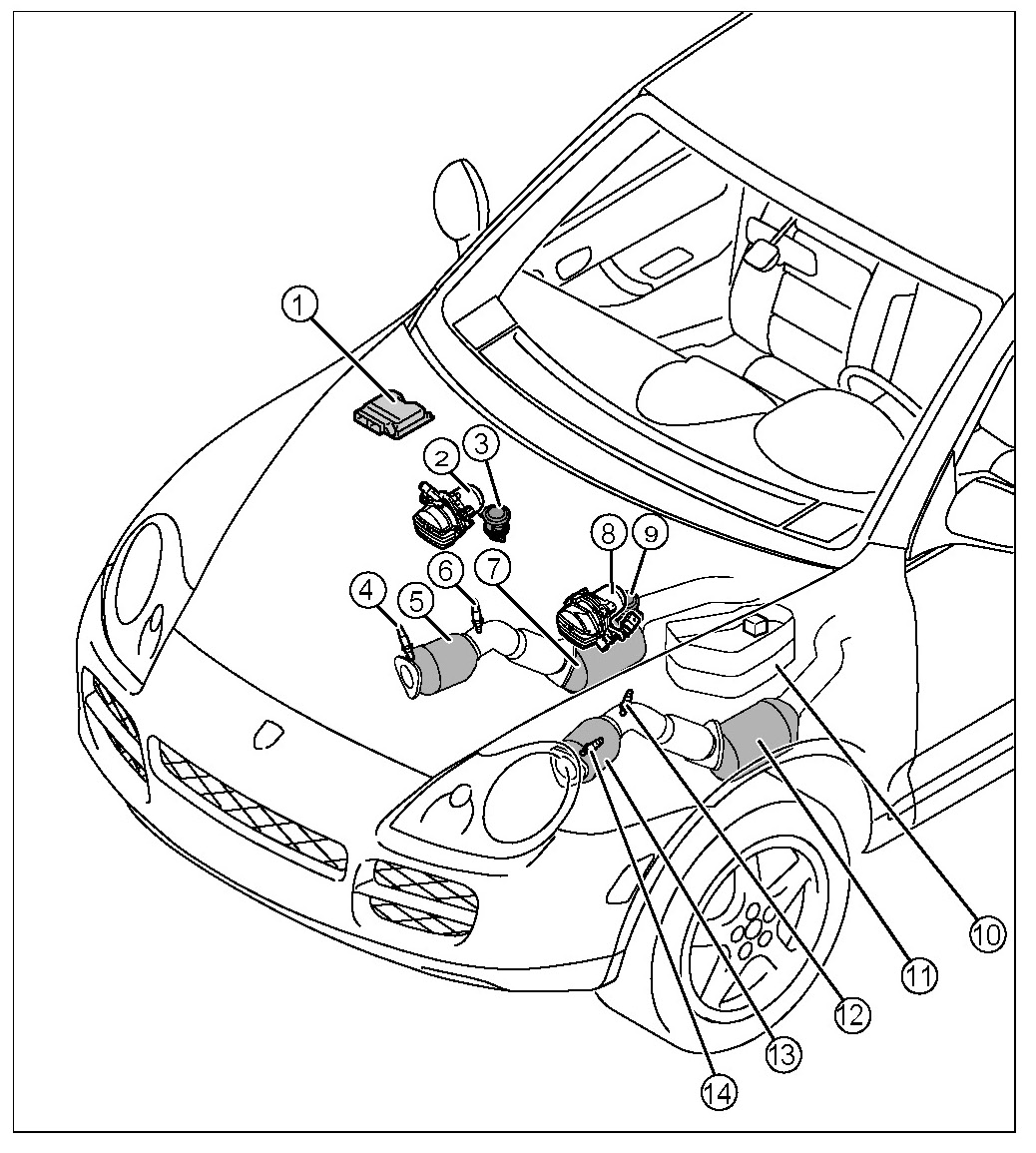 - Function-oriented grouping of components in the vehicle: Position of certain components in the vehicle which allow one or more diagnostic functions when used together. A number of relationships between fault memory entries and different components can be determined by presenting the components in this way.