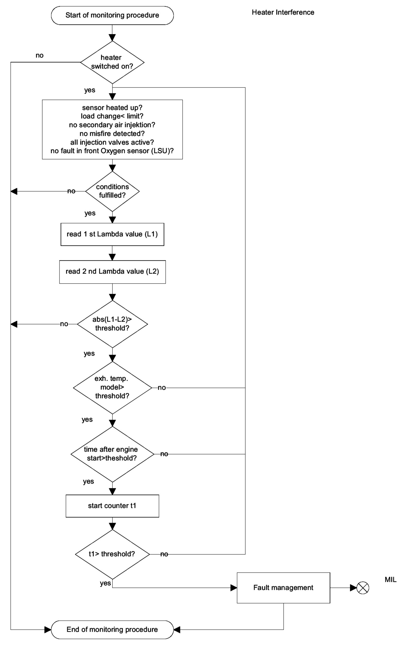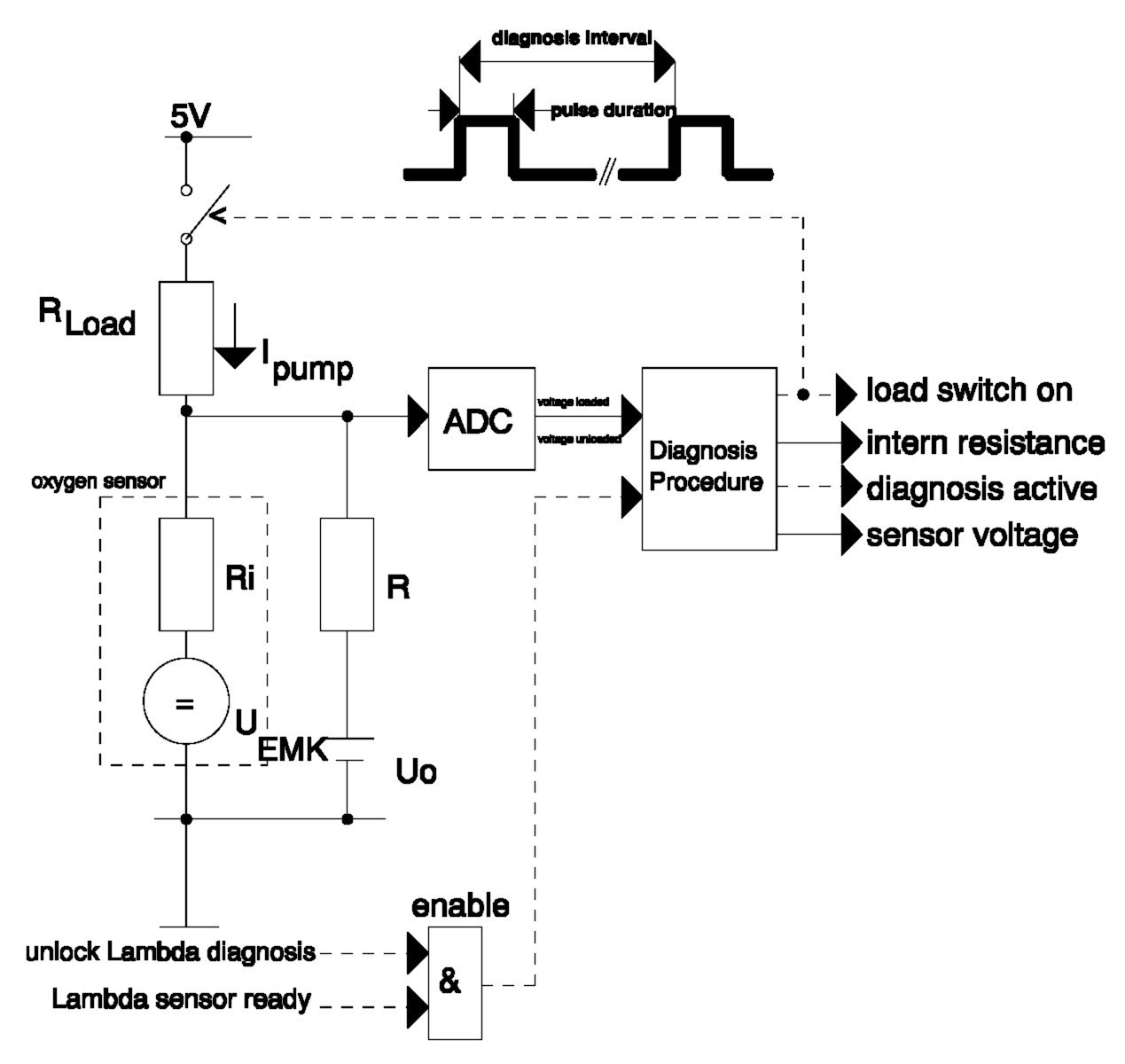 For diagnostic of the sensor heater a specific current pulse is supplied via a load resistance and the voltage is measured. The intern resistance of the sensor heater is calculated with the voltage deviation. The result will be compared with a reference map resistance, which considers aging and sampling deviations. In case of internal resistance > map resistance the diagnosis stores a fault and the MIL will be illuminated.