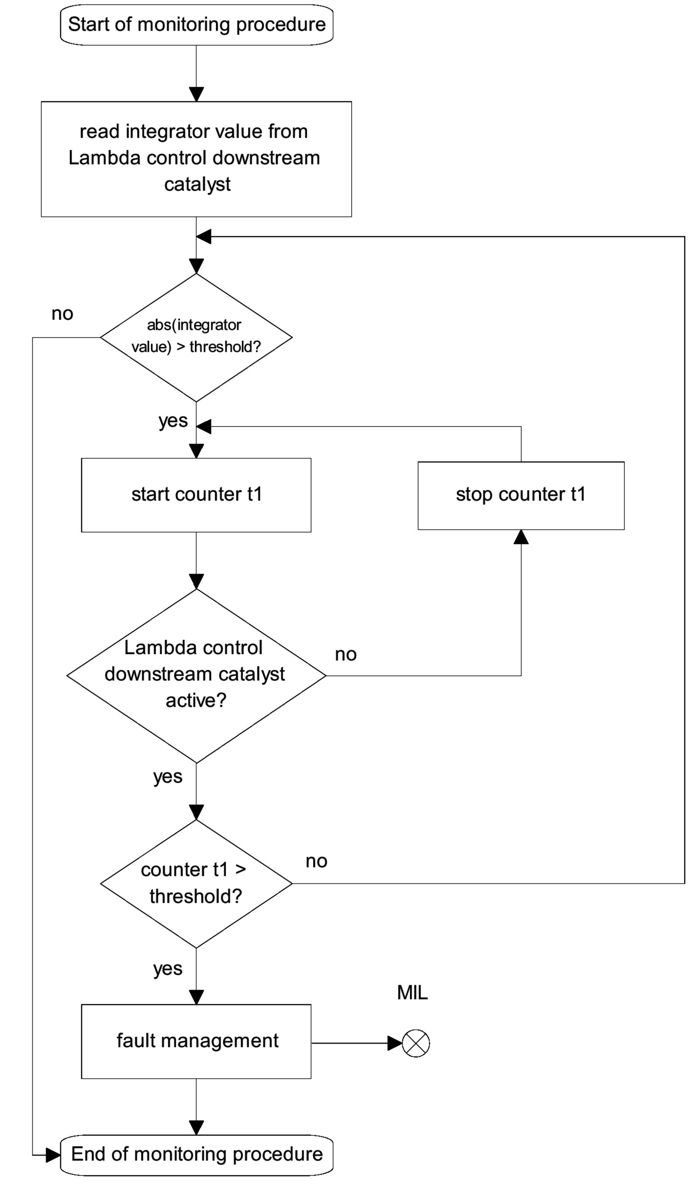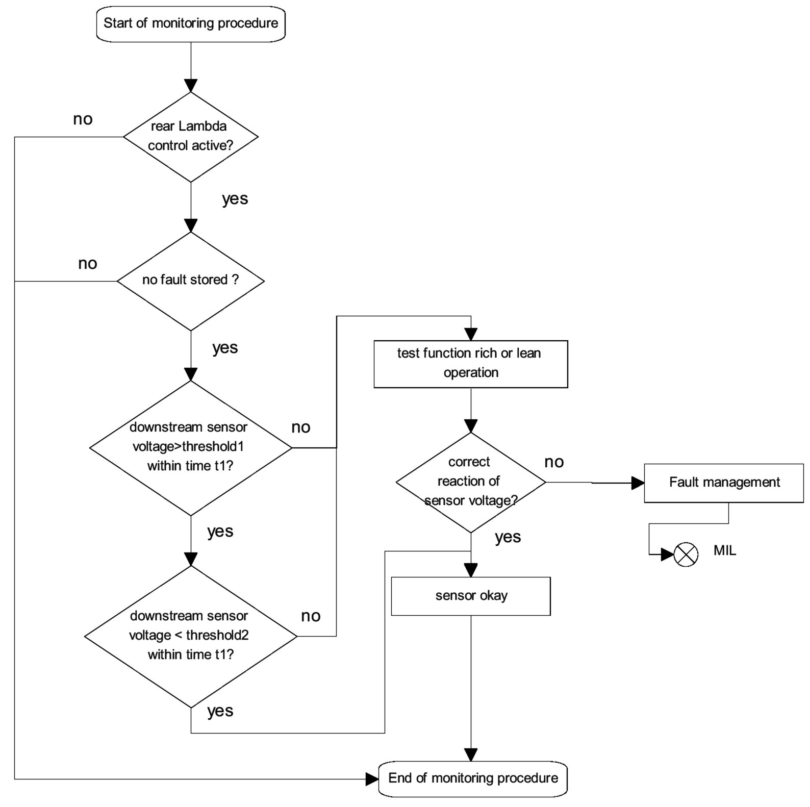 The Lambda value of oxygen sensor upstream catalyst is compared to the sensor voltage downstream catalyst. Additionally, a hardware check is performed by checking the sensor voltage range. Three diagnostics paths covers the air fuel ratio range of Lambda value (e.g. Lambda=1, lean, rich). A corresponding reaction of sensor voltage downstream catalyst is expected.