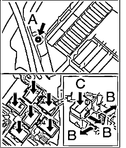 13. Release fuse carrier "arrows C" and pull it out and up "arrow D".
