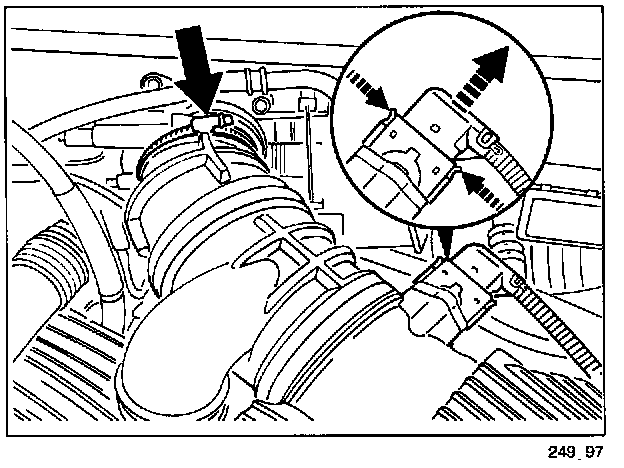 1.2 Undo hose clamp on throttle body and pull plug off the mass air flow meter. Unclip wire on air cleaner housing and remove air cleaner assembly.