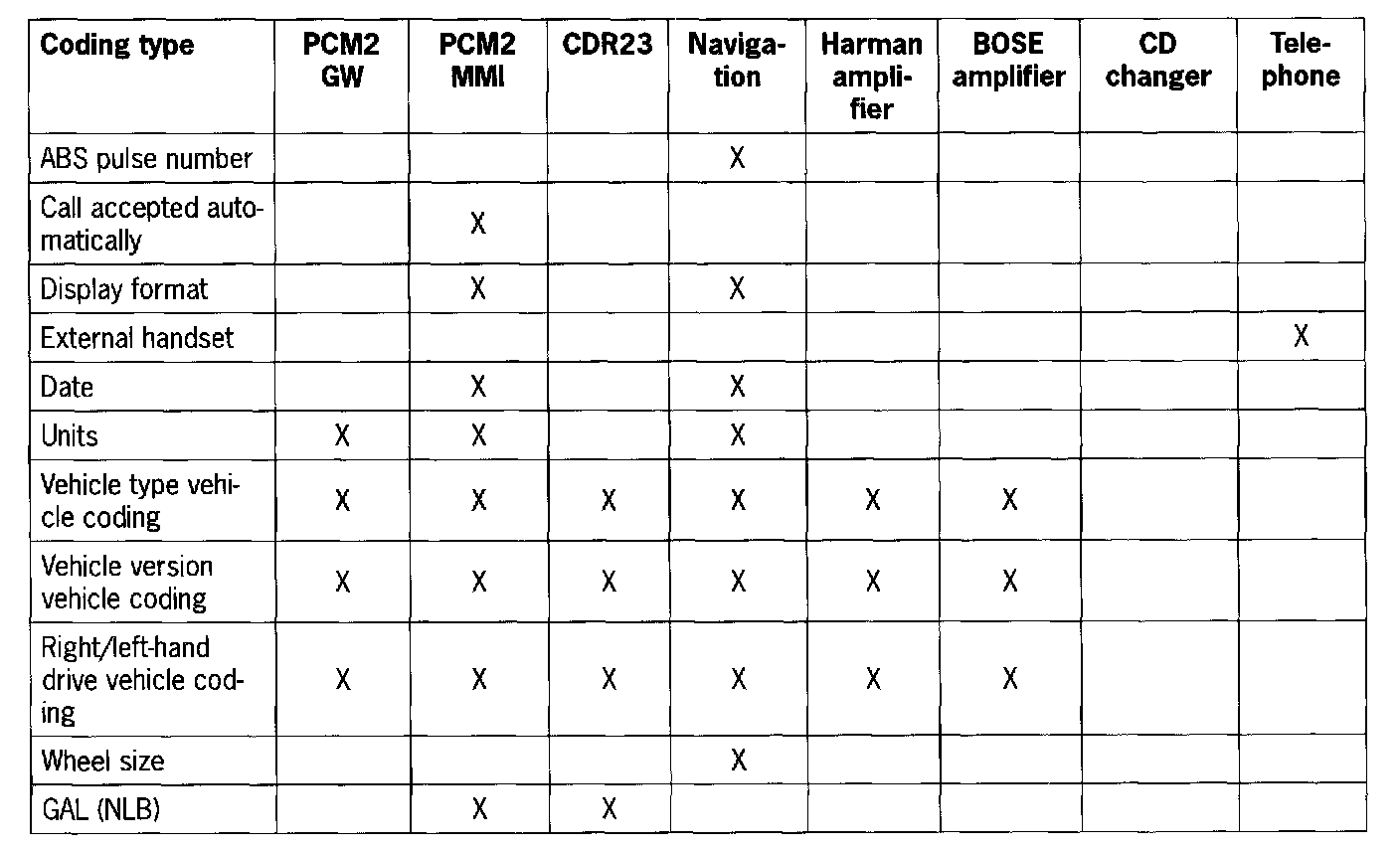 coding The PCM2 GW corresponding to the vehicle version can be coded using this menu item.