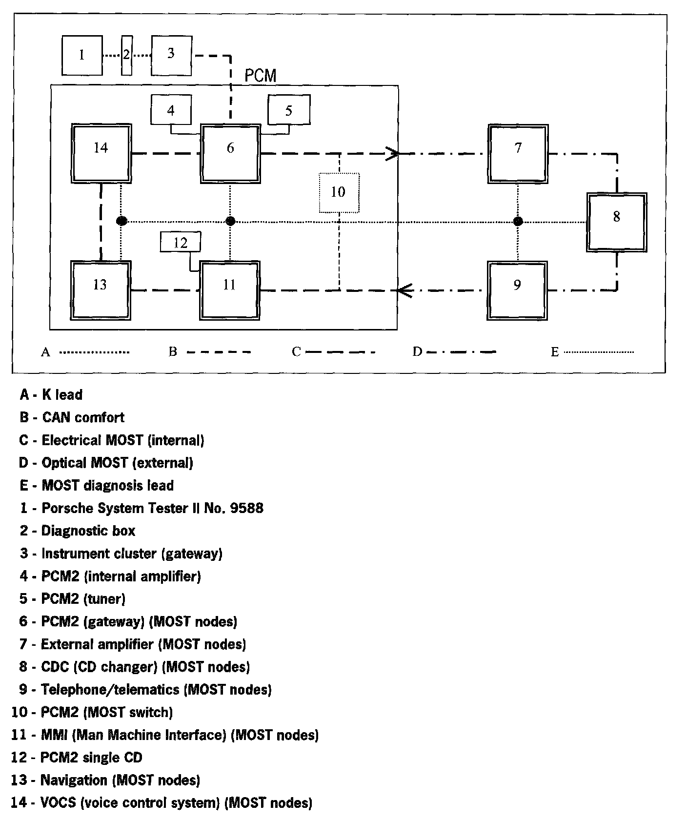 Communication between the Porsche System Tester II No. 9588 and the MOST control modules only takes place via the K lead to the instrument cluster. The data is transferred from the instrument cluster gateway to the MOST control modules, via CAN Comfort to the PCM2 gateway, via the electrical MOST in the PCM2 and via the optical MOST outside of the PCM2.