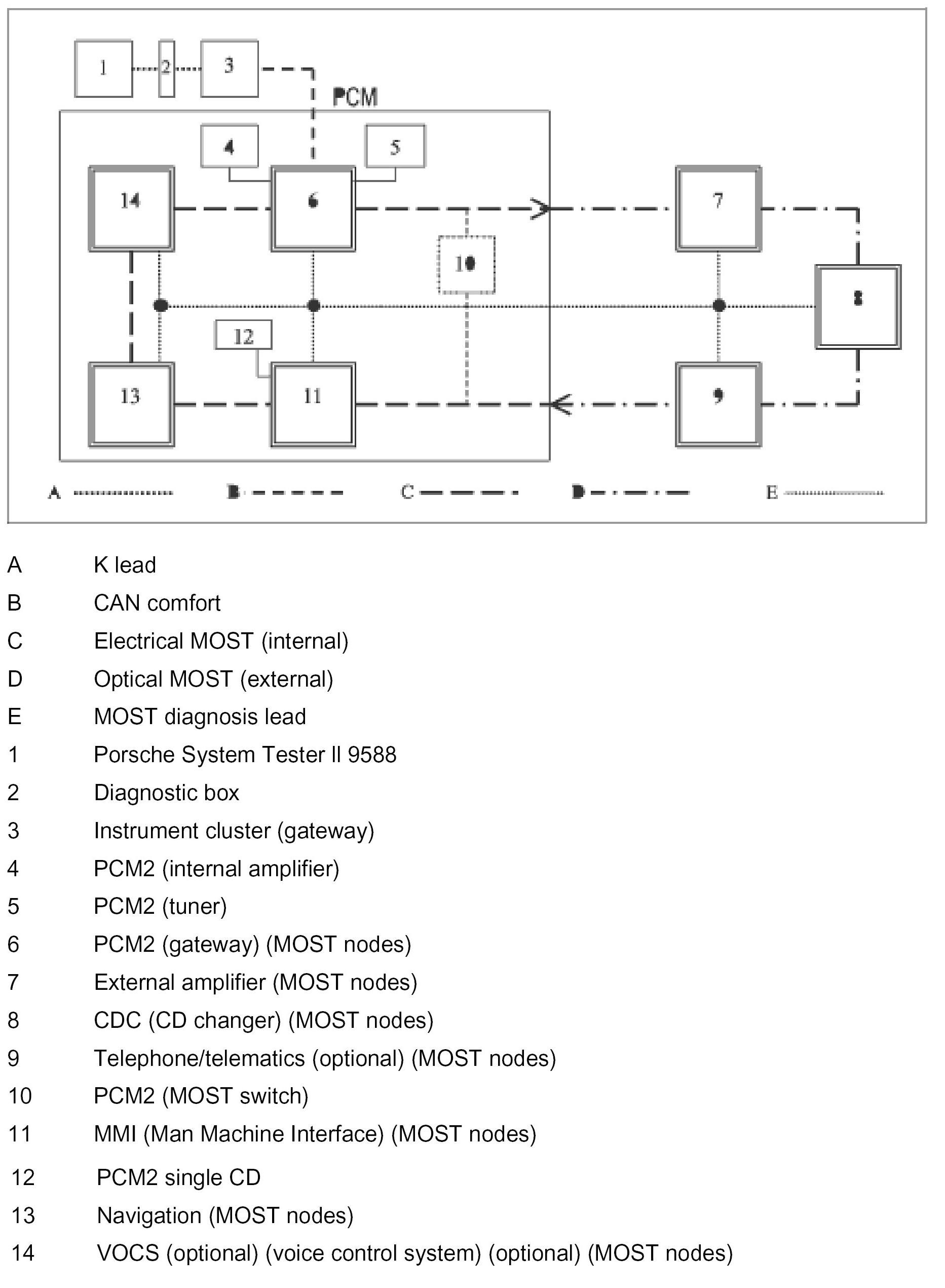The data is transferred outside of the PCM2 via the optical waveguide, which creates a connection to the nodes in the external MOST control modules such as external amplifiers, CD changers, and/or telephone/telematics (optional, depending on the equipment). The gateway node represents the connection to CAN comfort.