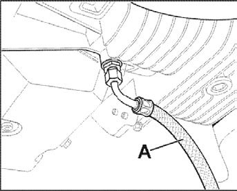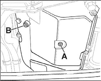 9. With engine running, top up ATF again until excess ATF emerges from the bore of the ATF control screw -B-.
