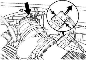 1.2 Undo hose clamp on throttle body and pull plug off the mass air flow meter. Unclip cable on air cleaner housing and remove air cleaner assembly.