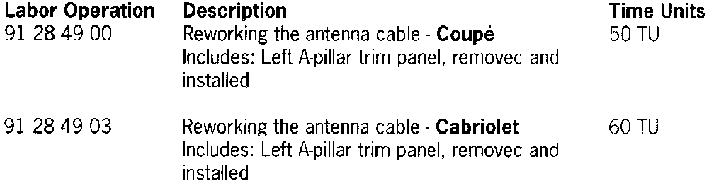 This caused excessive shielding of the antenna toward the outside, reducing the reception strength of the antenna. This lead to the range of the remote control being reduced. To avoid shielding the antenna and to increase the range of the remote control, the routing of the antenna lead in the area of the A-pillar has been changed as of the introduction date listed below.