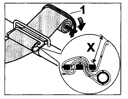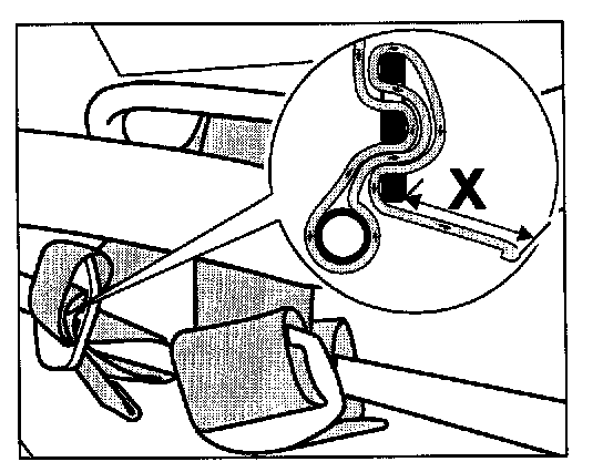 - Loop the belt strap in the direction of the arrow -inset-around the bucket seat transverse strut into the adjustible slider. The projection -dimension = X- of the belt strap must be at least 100 mm.