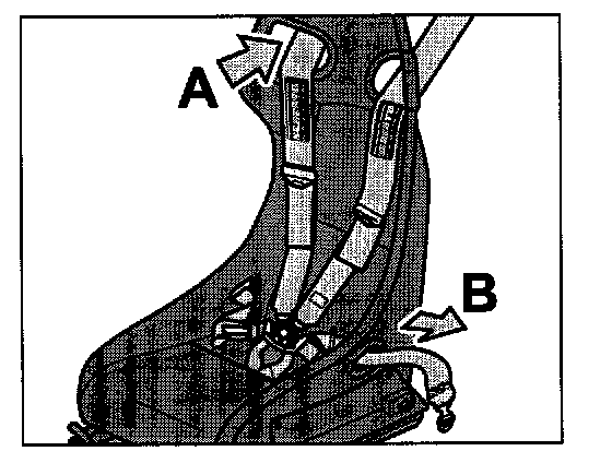 - Pull six-point seat belt through the upper openings in the backrest from behind -arrow A- and through the openings in the seat frame from the side -arrow B-.