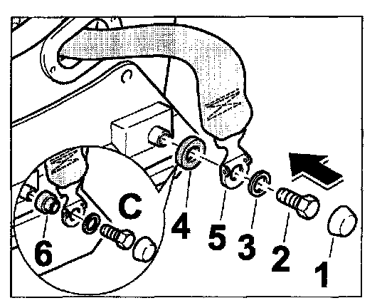 - Position foam part -4- and belt fitting -5- at the left and right on the seat frame. With the shim -3- and the fastening screw -2-, screw the belt fitting -5- tight. Position the cover -1- on the fastening screw -2-.
