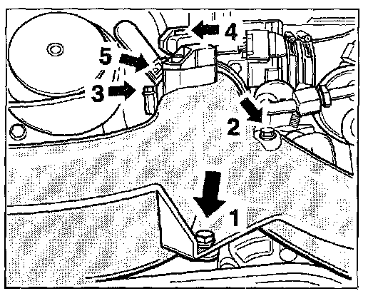 6. Undo pressure pipe -middle- by removing the spring clip -5-, hose clamp -3-, hexagon-head bolts -1 & 2- and electrical plug -4-. Pull off vacuum hose to the control valve.