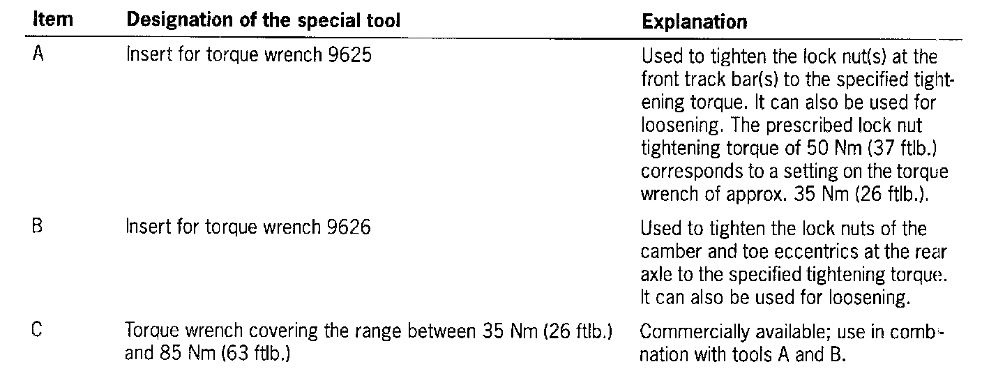 There are few differences between suspension alignment on the new 911 Turbo (996) and suspension alignment procedures on the 911 Carrera (996). This involves the vehicle height adjustment, the wheel-load difference from left to right, special tools and corrections to wheel alignment.