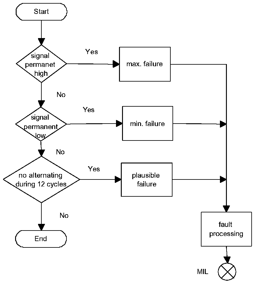 If the signal during a fixed number of engine revolutions continuously is high or low a max or min fault is detected.