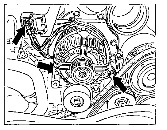 8. Remove air conditioning compressor from the bracket for the generator. Unscrew the three screws -arrows- for this purpose. The throttle body can be swung upward for better accessibility to the front screw. To do this, the two hose clamps must be removed.