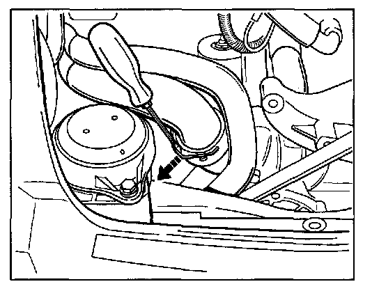 13. Pull off the hose clamp -arrow- on the coolant connecting hose. Take bracket for the generator out of the engine compartment upward and to the right.